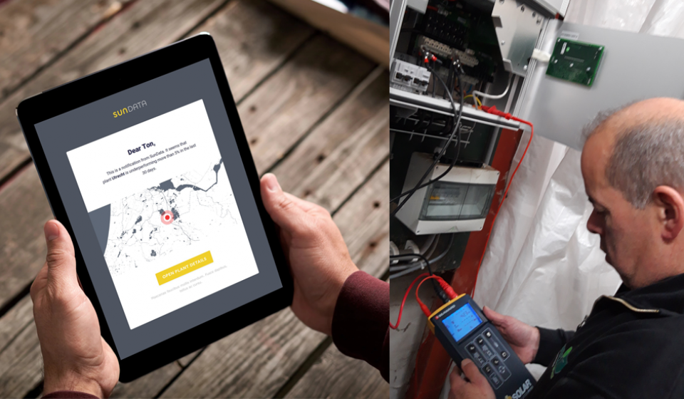 Om een 100% werkingsgarantie te waarborgen, maakt Agro-NRG gebruik van serviceplatform SunData. “SunData monitort onze onderhoudscontracten, geeft aan als er storingen zijn en doet de rapportages. Twee keer per week krijgen we een bericht waarin staat of er afwijkingen zijn van de verwachte opbrengsten. Als dat zo is, kijken wij in het portal wat het probleem is. Bij storingen die impact hebben op de opbrengst, gaan we op pad.” Vroeger ging het er heel anders aan toe, vertelt Ter Horst: “Voorheen hadden we zeven omvormerportals die we in de gaten moesten houden. Die wel honderden storingen konden melden. Daardoor misten we de ‘echte’ storingen.” Hiermee doelt Ter Horst op de vele meldingen die ontstaan door externe oorzaken, die buiten het takenpakket van de installateur vallen. “80 procent van deze storingen bleken aan uitval van de wifi-router te liggen. Die hebben dus niets met de installatie te maken. Maar wij werden wel door de klant gebeld. Daarom hebben we de monitoring uitbesteed aan SunData. Die hebben een slim systeem ontworpen om ons te ontzorgen. Anders moest ik hier iemand extra voor aannemen.”