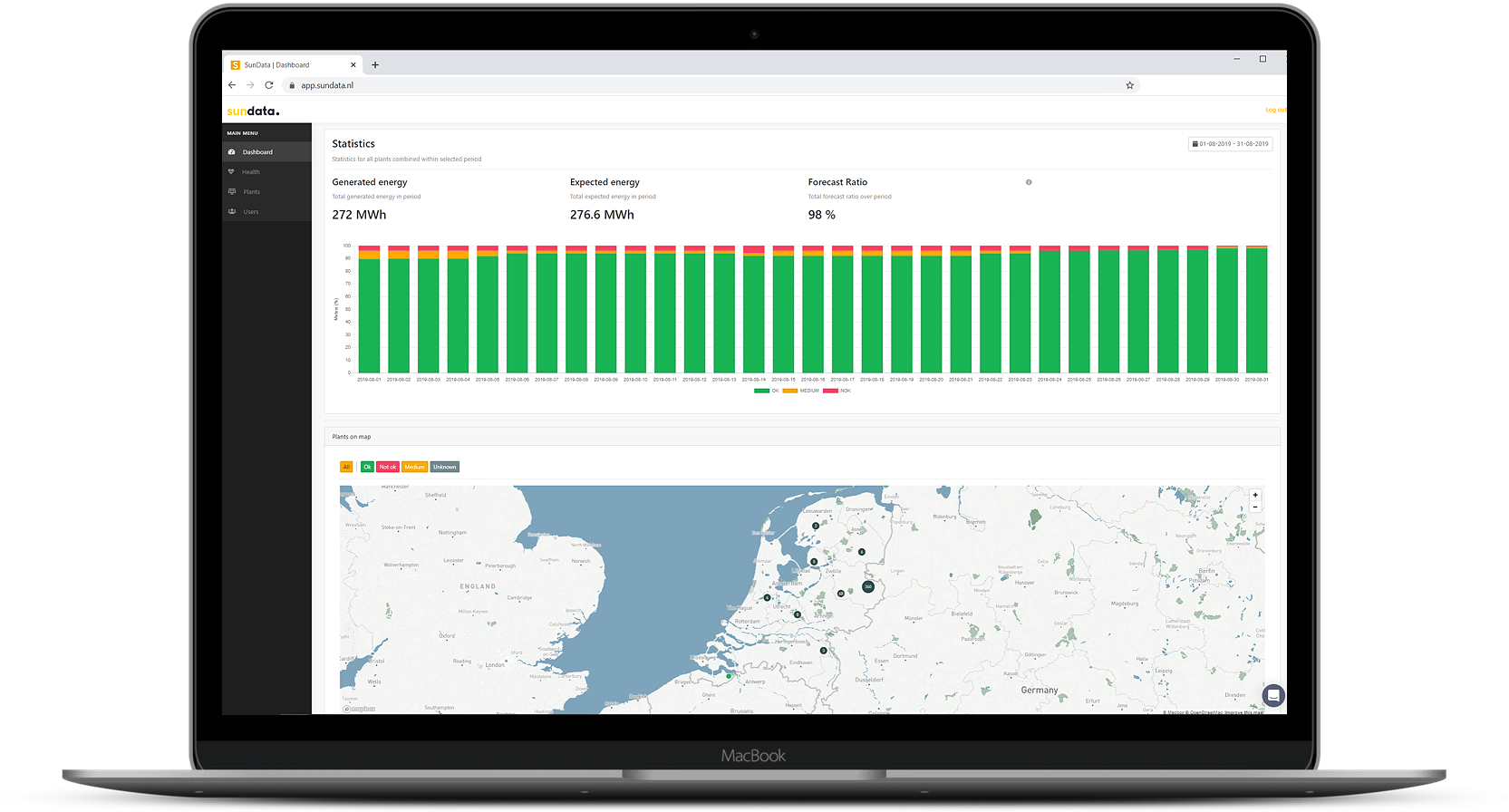 In het Dashboard zie je hoe alle zonnepanelen presteren per dag, maand of jaar. SunData PRO geeft daarvoor alle pv-installaties regelmatig een status-update: OK (groen), Medium (oranje) of Not OK (rood). Hierdoor zijn problemen snel te ondervangen: je ziet in één oogopslag of alle zonnepanelen optimaal presteren. En is dat niet het geval, dan onderzoek je in Plants of in de kaartweergave (zie hieronder) waar je direct aan de slag moet.