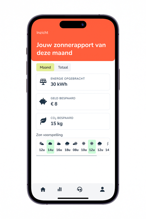 Zonnewijzer is een white-label app: in de huisstijl van de installateur of woningcorporatie. Bewoners zien dus niet “weer een nieuw portaal”, maar gewoon jullie eigen app. Dat helpt enorm om service netjes op één plek te houden.